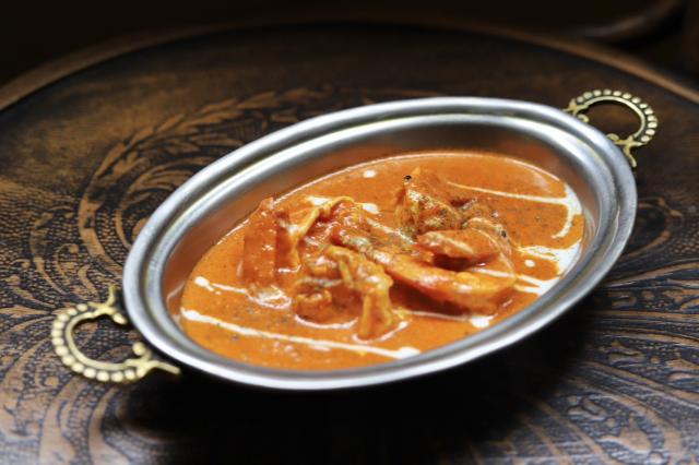 「海老のバターブローン」:北インドの代表的なカレーベースから作る、クリーミーなトマトソースの海老カレーです。海老の殻から出汁を取り、風味豊かに仕上げます。